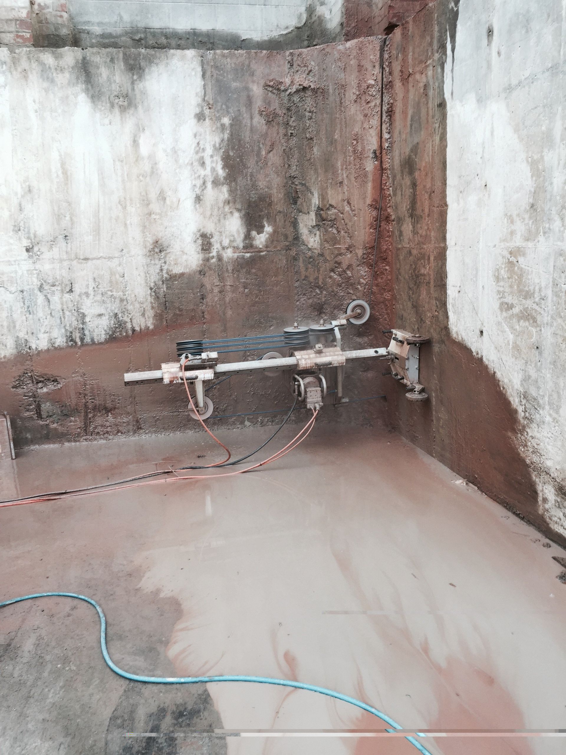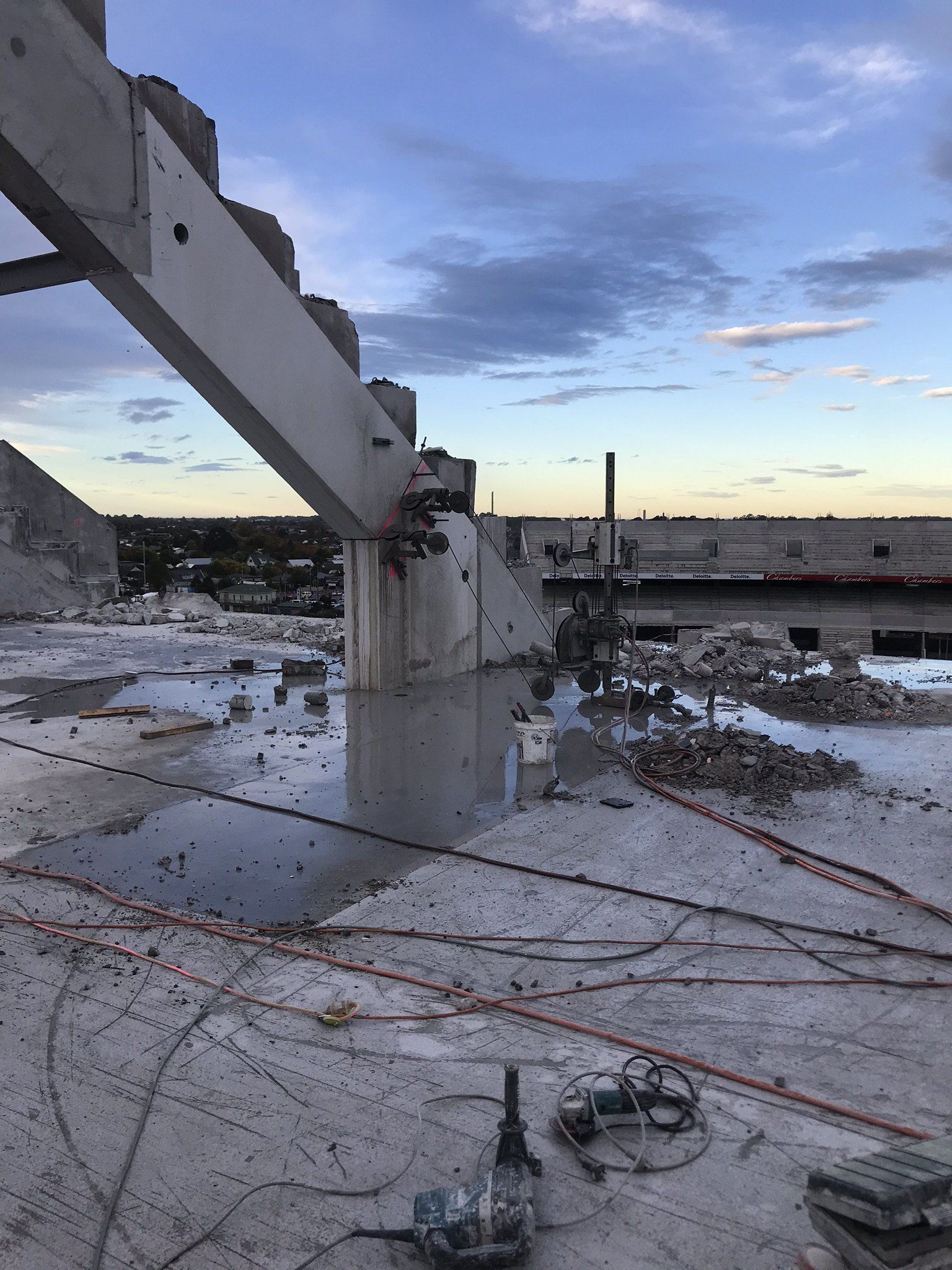 2 wiresaws simultaneously running while crane is hooked on to remove concrete & timber structure.